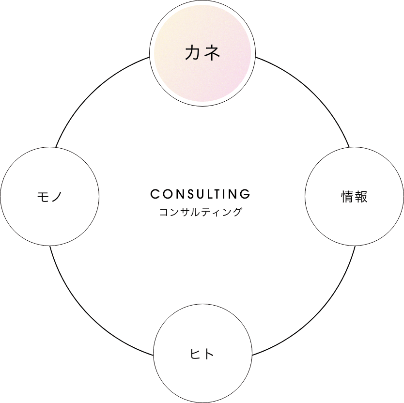 財務コンサルティングとは、経営資源で必要となる「ヒト・モノ・カネ・情報」の中の「カネ」に重点を置いたコンサルティングで、企業の財務諸表から経営状況を判断し、経営上の課題を解決や資金繰り改善やご提案をさせていただいております。